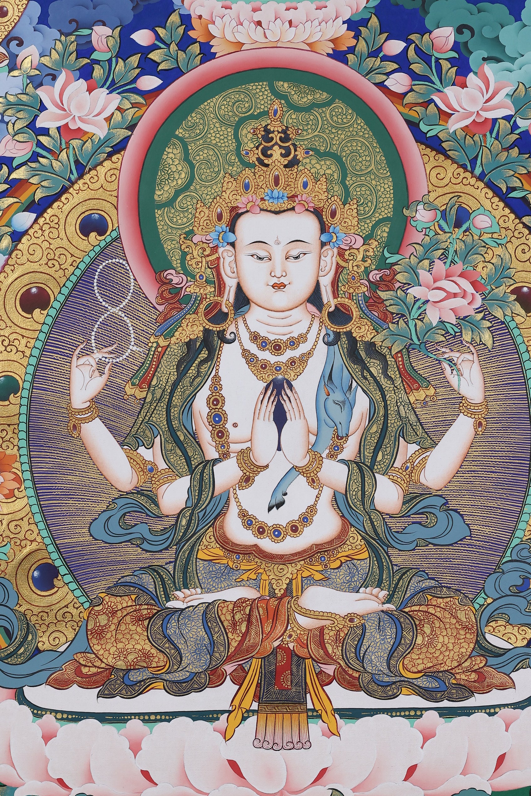 At the heart of this Thangka sits the Four-Armed Avalokiteshvara (Jigten Chukai in Tibetan), the most revered bodhisattva of compassion: