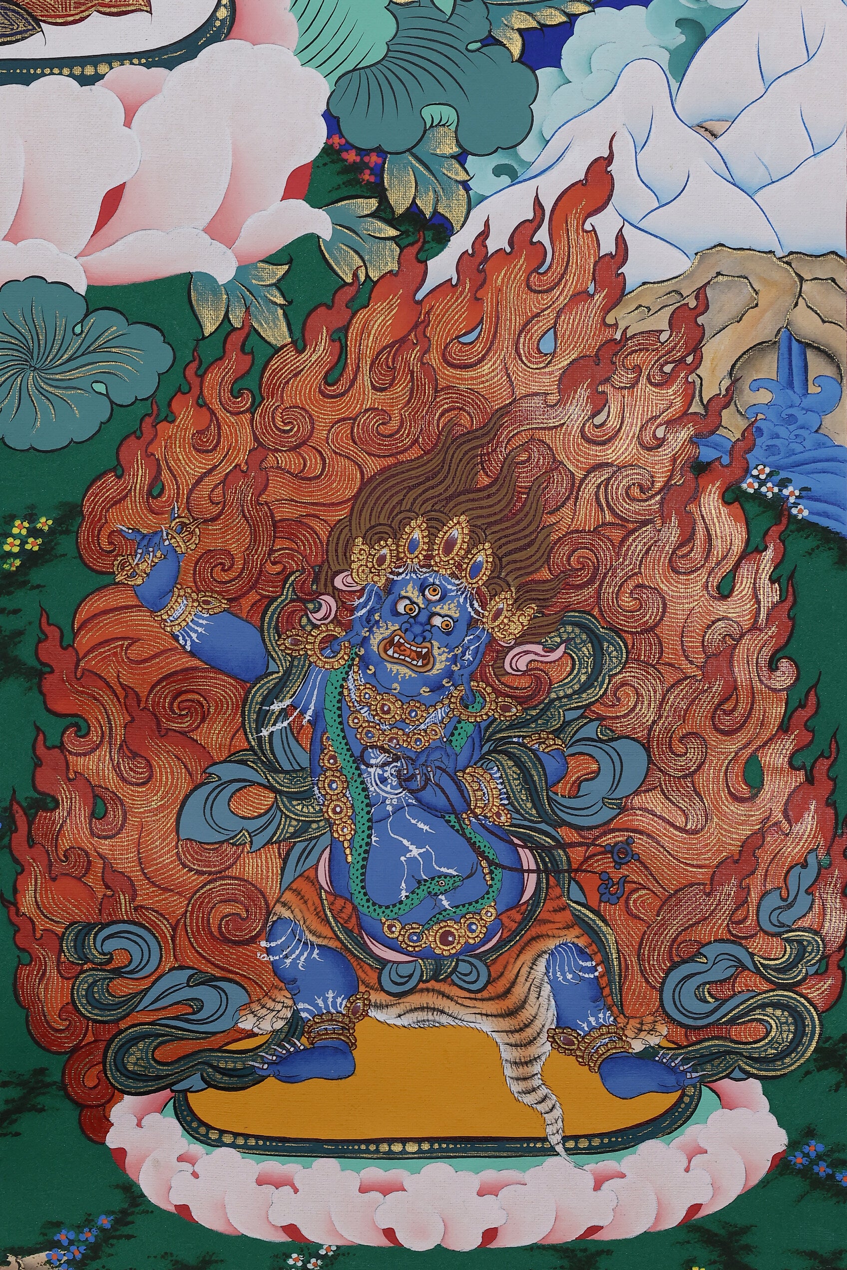 The Thangka features a complete spiritual pantheon of Tibetan Buddhism: