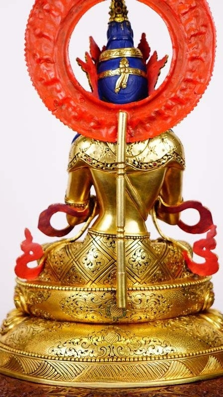 This statue is entirely handcrafted according to traditional Tibetan sculptural techniques. The surface is finished with rich gilding, while the fine details are painted using natural mineral pigments, ensuring enduring brilliance, depth, and sacred authenticity. The larger 38 cm scale enhances its presence, making it a powerful centerpiece of Buddha Statue-Art suitable for both devotion and refined collection.