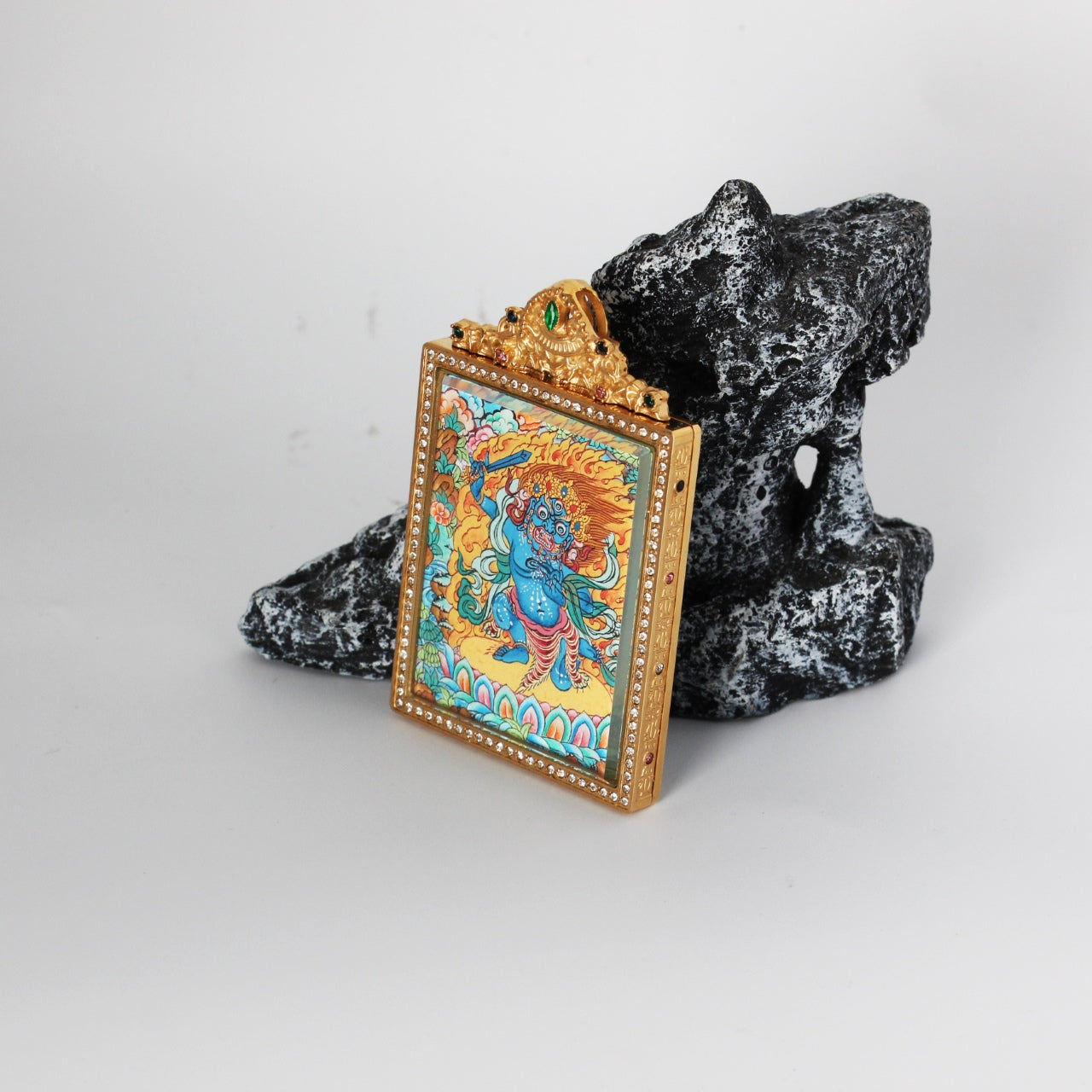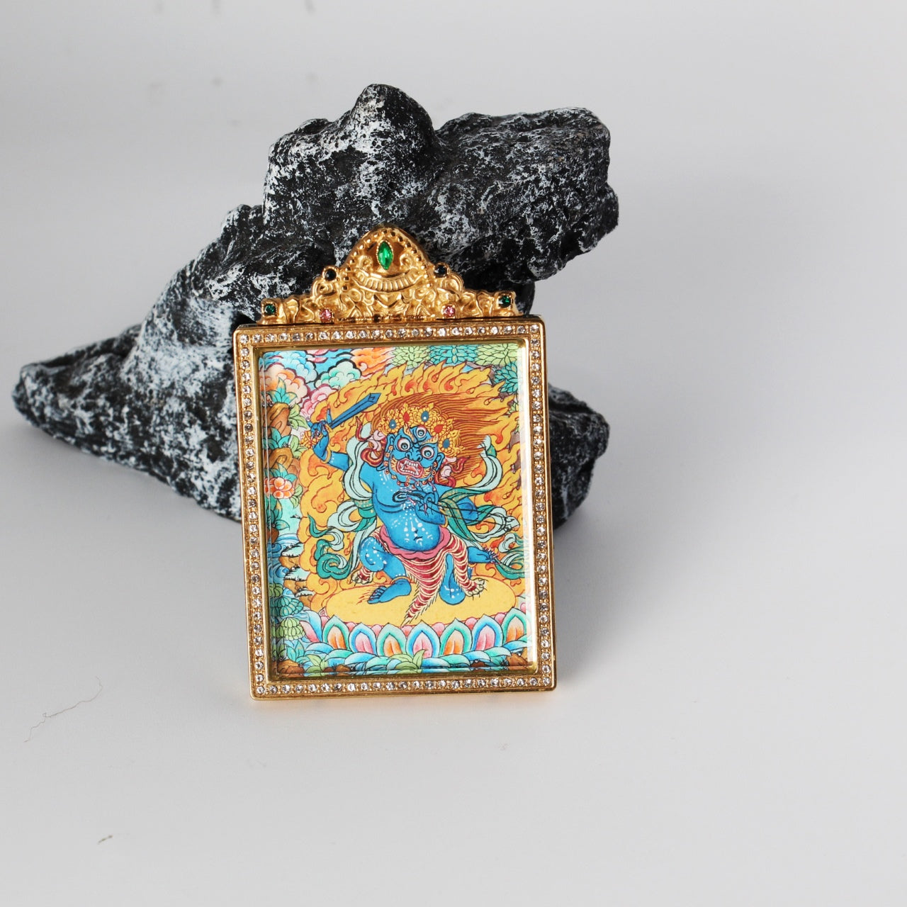 I. Cultural Context: The Immovable Protector Acala (Achala) is revered as the wrathful form of wisdom that "subdues all obstacles" (降伏一切障碍). In Tibetan and Nepali tradition, he is the chief of the five wisdom kings (五大明王之首) and the wrathful expression of the Buddha's resolve—the one who awakens beings to discipline and resilience (喝醒众生,使自律坚韧) and helps them realise their inner wisdom (发挥自身智慧潜力). He is invoked for "protection and removal of obstacles" (护佑除障) and "stability in practice" (修行稳固). Tradition holds that he drives away afflictions and evil forces that disturb sentient beings (使侵扰众生之邪魔畏惧而远离), so that practitioners may seize life's opportunities and enjoy family happiness and peace (抓住人生机遇,家庭幸福美满,一生顺遂). This Nepal Premium Thangka pendant is a portable shrine designed to help the wearer "subdue inner and outer obstacles" (降伏内外障) and attract "protection and success" (护佑与成就).